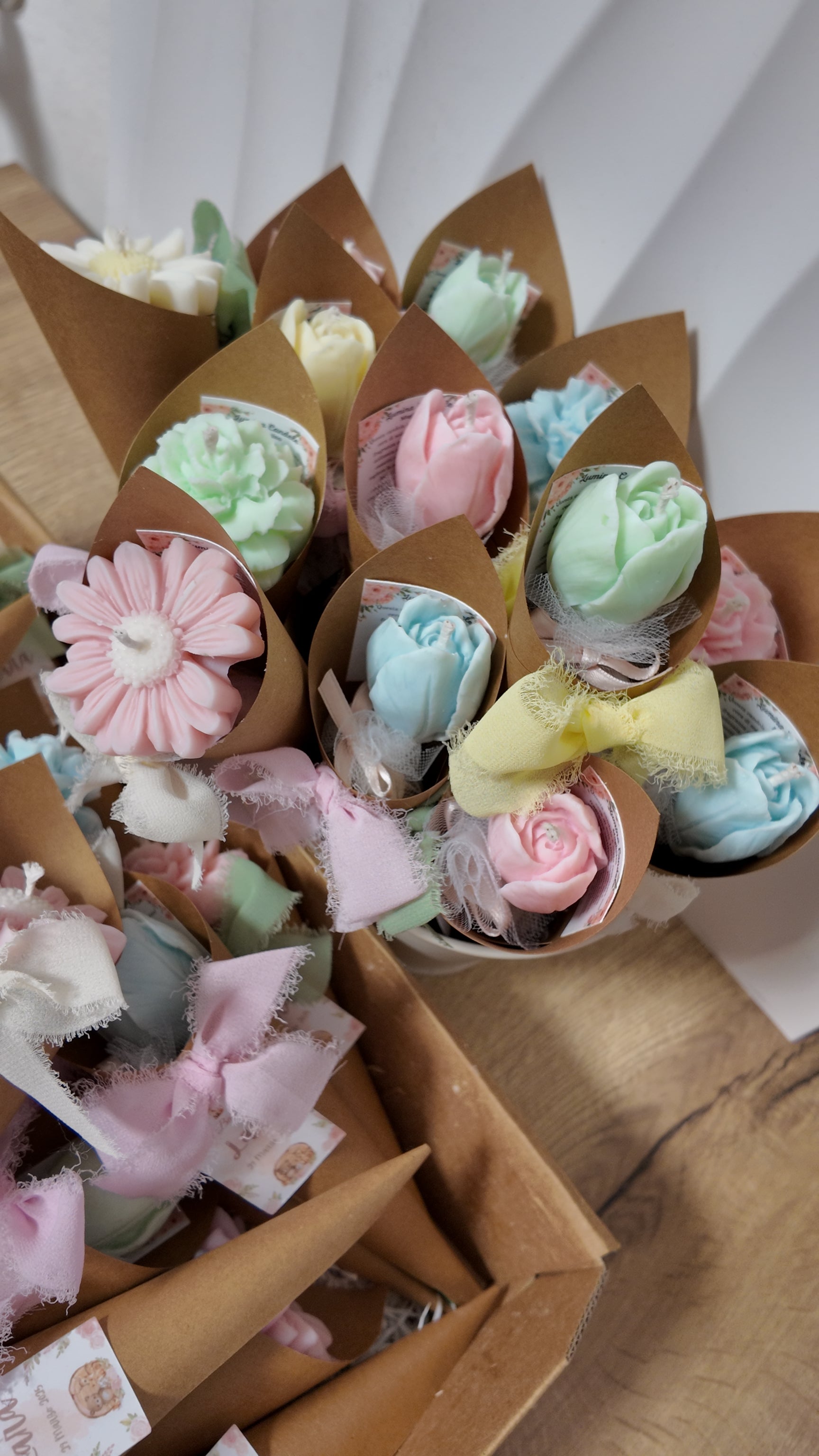 Ogni fiore è modellato con cura, con forme armoniose e dettagli raffinati, per creare una bomboniera che possa essere apprezzata anche come oggetto decorativo.